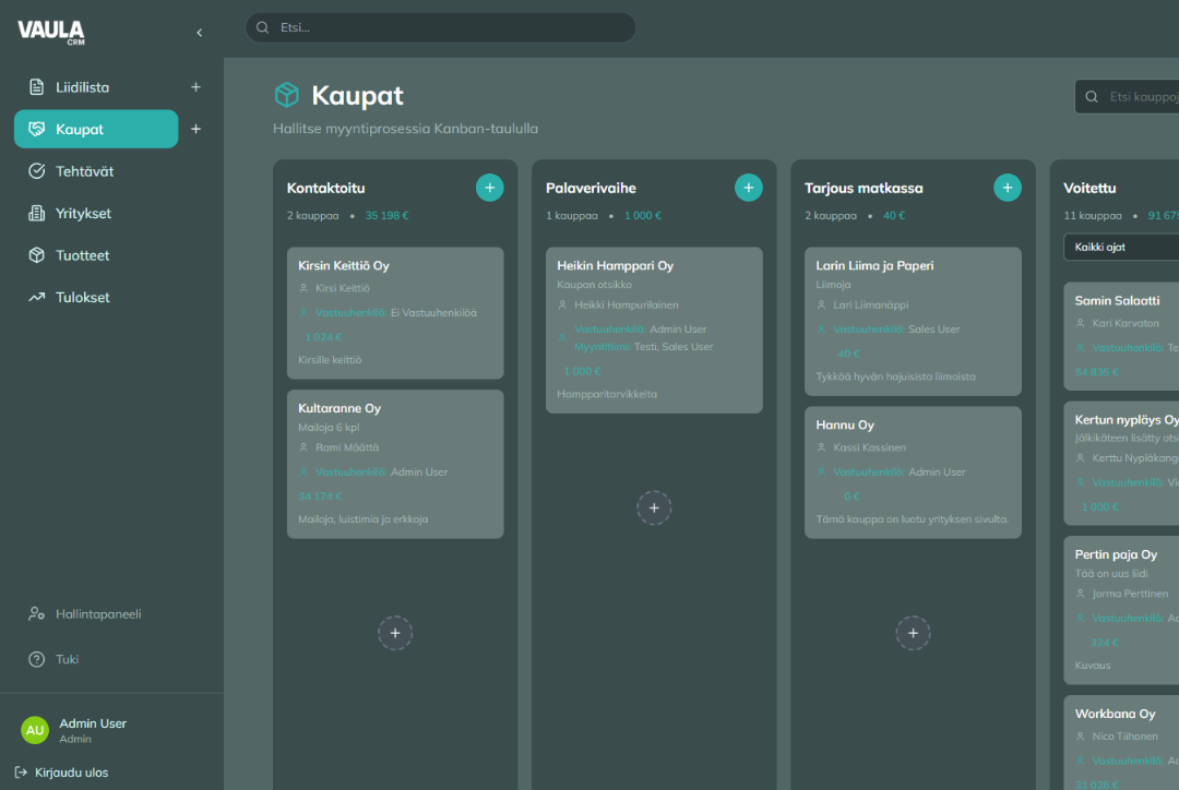 Vaula ei yritä olla kaikkea kaikille – se keskittyy olennaiseen. Kevyt, nopea ja selkeä CRM, joka saa myynnin virtaamaan ilman vastusta.