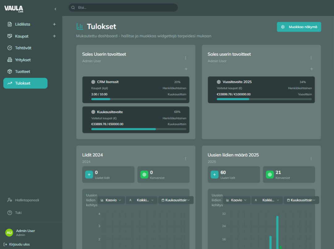 Näe liidien määrä, kauppojen arvo ja tiimin eteneminen yhdellä silmäyksellä.