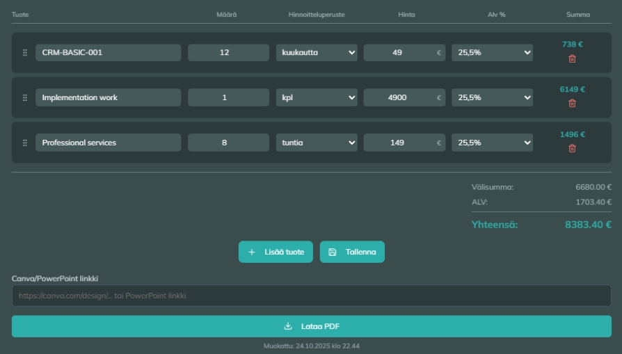 Valmiit pohjat, tuotelistaus ja automaattiset laskelmat – ilman erillisiä työkaluja.